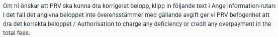 I det fall det angivna beloppet inte överensstämmer med gällande avgift ger vi PRV befogenhet att dra det korrekta beloppet / Authorisation to charge any deficiency or credit any overpayment in the total fees.