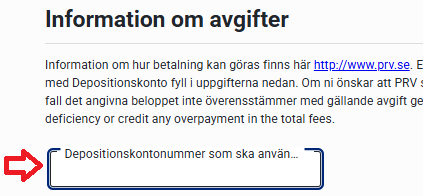 Det är enbart när fältet för Depositionskontonummer under Information om avgifter / List of fees är ifyllt som betalningsbegäran skickas vidare till vår ekonomiavdelning per automatik. I efterföljande åtgärder dyker fältet för depositionskonto upp först när man laddar upp ett dokument som är kopplat till en avgift, t.ex. Återupptagningsavgift för avskriven patentansökan.
