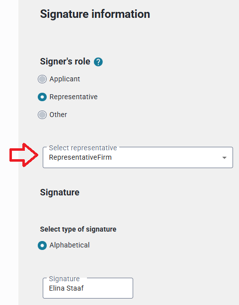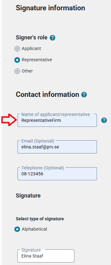 Skriv ombudsfirmans namn i rutan för Name of applicant/representative
