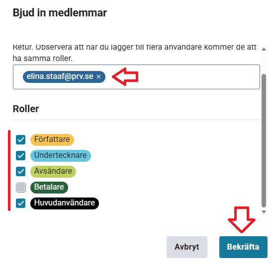 Välj en eller flera roller. Om flera användare läggs till samtidigt kommer de få samma roller.