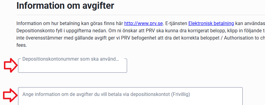 -Bifogandet av meddelandeavgift öppnar möjligheten att ange depositionskonto. Ange ditt depositionskonto i rutan för Depositionskontonummer under ”Information om avgifter”. Om relevant, ange information om de avgifter du vill betala via depositionskontot, t.ex. om du även önskar betala årsavgift.